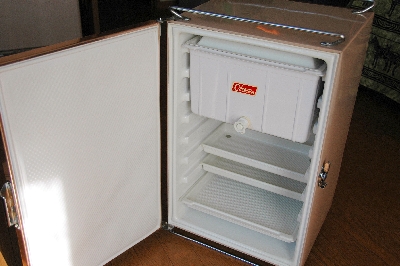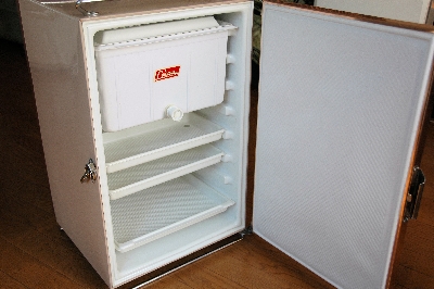 開くと棚が付いており好きな場所に棚を移動したり 取り外しが出来て機能的に使えます。 まるで自宅の冷蔵庫感覚。  一番上のウォーターディスペンサーに氷を入れておくと 冷気でクーラー全体が冷える仕組みです。 もちろん溶けた水は蛇口から出ますので冷たい水を飲むことが出来ます。 何と効率的!  棚を全て出せば通常のクーラーと同じように使えます。 でもこの使い方はちょっともったいないかな… |