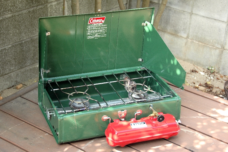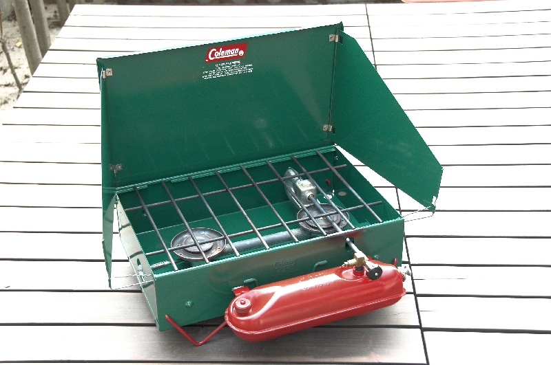 Coleman 413G 明るい緑のバーナーです。五徳が丸くなっていてパーコレーターなどを安定して置くことが出来ます。このGの他にE・F・Hなどがあり、このシリーズは私のお薦めです。 |