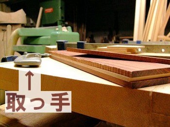 2種類の異なる板を貼り合わせ、取っ手となる木材を用意します。